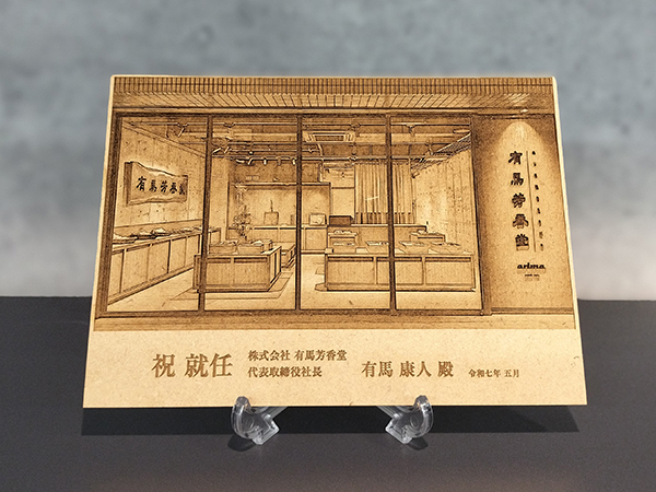 神戸市を拠点に、100年以上の歴史を持つ老舗ナッツメーカー「株式会社有馬芳香堂」様の節目にあたる、代表者ご就任を記念し、木製のレーザー彫刻プレートを制作いたしました。