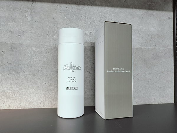ステンレスボトルは直径67mm×高さ216mmで、内容量は500mlです。断熱性に優れた真空二重構造を採用。外気の影響を受けにくいため、飲み物の温度を長時間一定に保ちます。温かいものは温かいまま、冷たいものは冷たいまま、最適な温度を長時間持続させる高機能ステンレスボトルです。表面には昭栄様のブランドである「神戸浪漫」のロゴと神戸のイラスト、そしてキャッチフレーズを印刷しました。