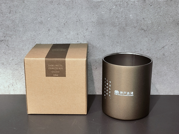 マグカップは直径87mm×高さ100mmと、たっぷり飲める430mlの大容量。本体はメタリック塗装のブラックとブラウンが選べます。真空二重構造を採用し、優れた保冷・保温力を発揮します。表面には昭栄様のブランドである「神戸浪漫」のロゴとキャッチフレーズをシルク印刷で表現しています。化粧箱入りのため、ノベルティにも最適です。